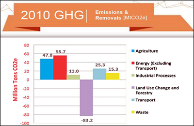 To support his assertion that trees and wood will save the world from climate change, Mr. Carlos presented a chart by the Climate Change Commission of the Philippines showing that in 2010, a total of 155.1 million tons of carbon emissions were caused by agriculture, energy, transportation, industrial processes and waste, but 83.2 million tons of carbon removals and capture were achieved by land use change and forestry.