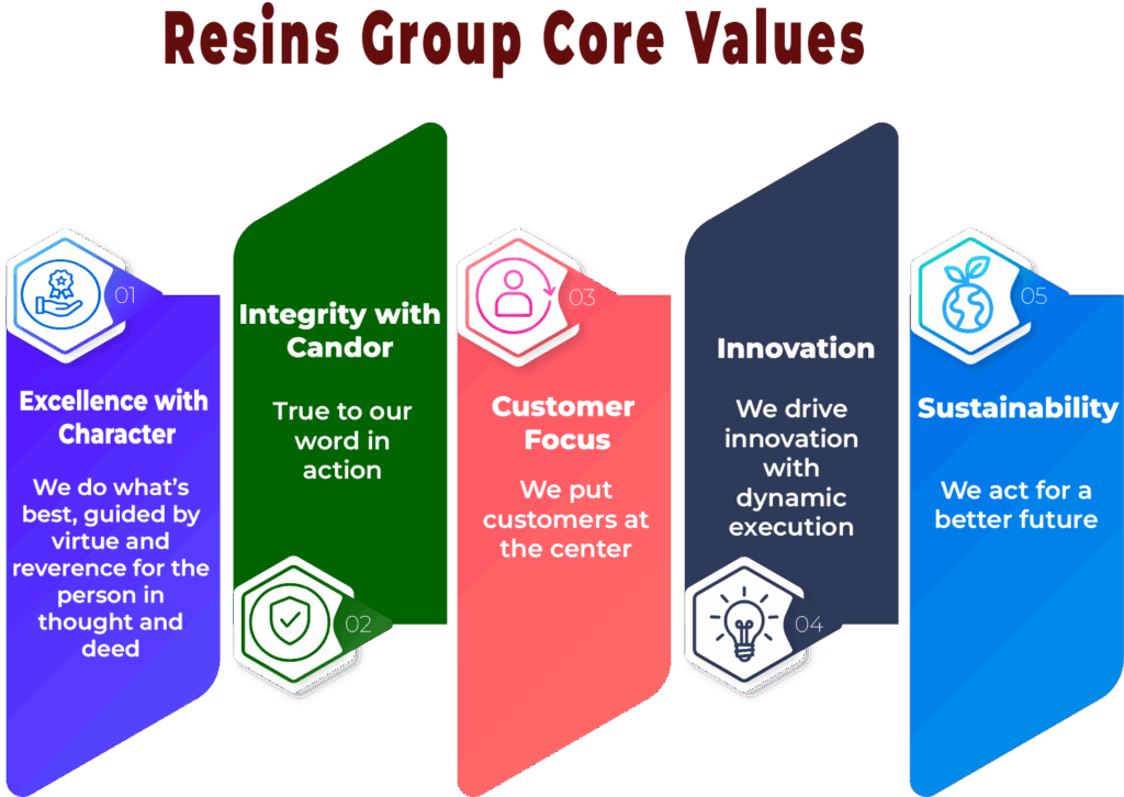 By internalizing these core values, Resins Inc. challenges its workforce to think bigger and act bolder — to become more agile, more innovative, and more customer-driven. These principles are intended to ensure that the company does not merely respond to change, but leads and shapes it for the benefit of all its stakeholders.